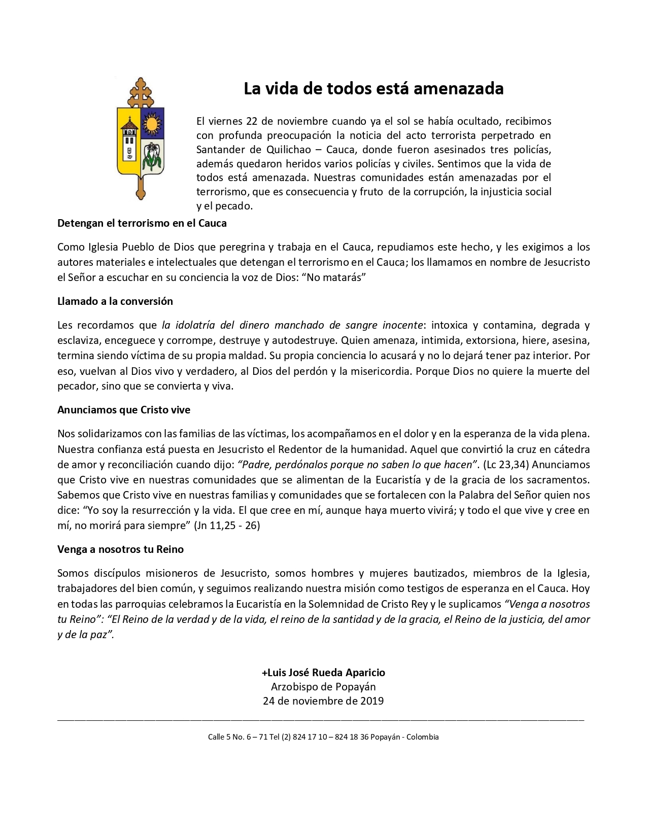 En un mensaje el arzobispo de Popayán, monseñor Luis José Rueda Aparicio, repudió el hecho del acto terrorista perpetrado el pasado 22 de noviembre en Santander de Quilichao – Cauca, donde perdieron la vida 3 policías y otros policías y civiles quedaron heridos.